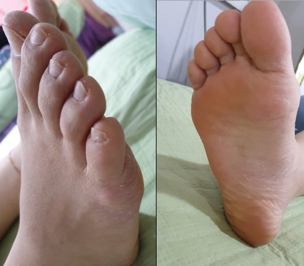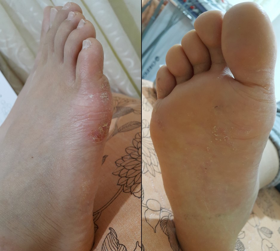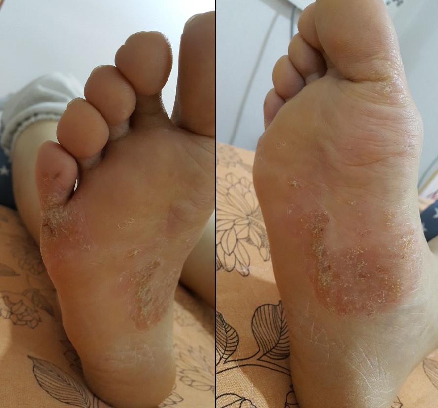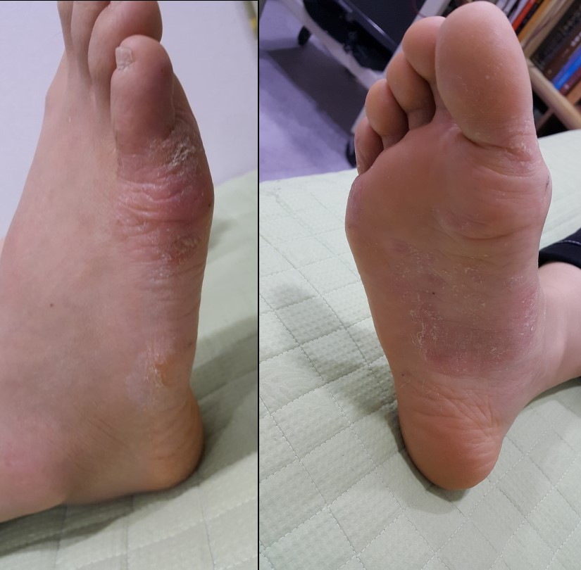 2020.10.17. 내원하신 여성 환자의 우측 발 상태로, 발바닥과 새끼발가락 외측에 한포진 증상이 심한 상태로 내원하셨습니다. 처음 발생 시점은 2020. 5월경인데, 다른 피부 전문치료 한의원에서 4개월 한약치료를 받다가 그다지 호전되지 않아서 저희 한의원에 내원하셨습니다. 심한 가려움(소양감) 및 진물 증상을 호소하셨습니다.