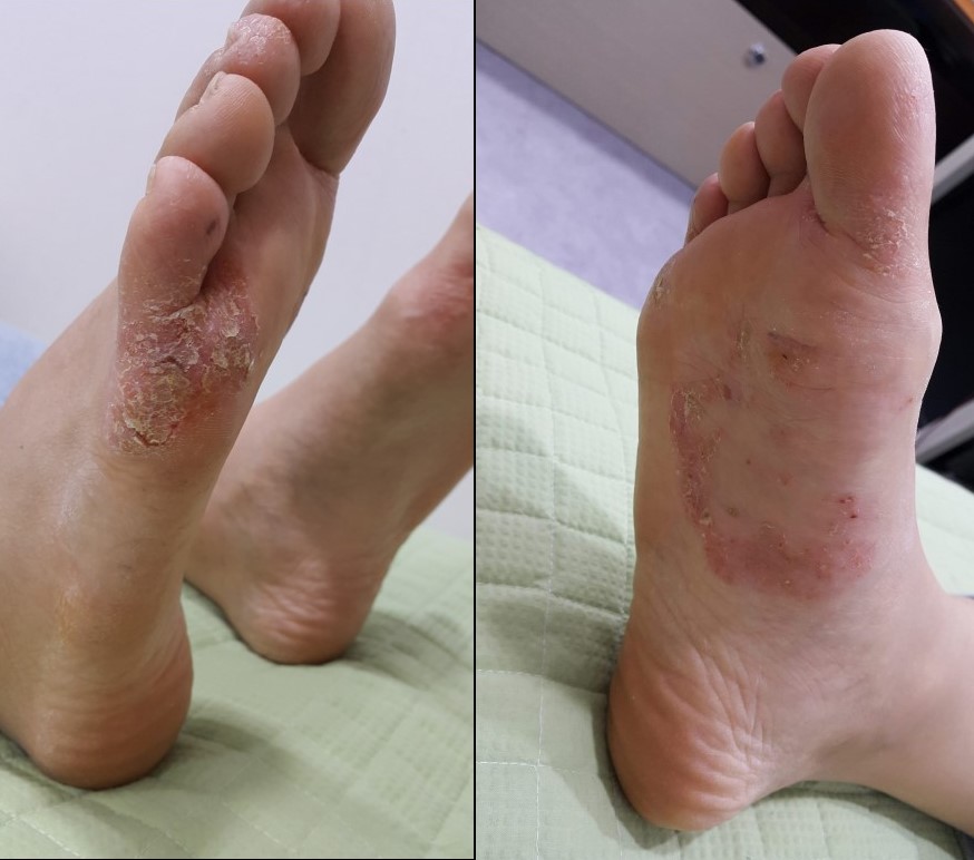 (체질 한약 투약 날짜는 초진인 2020.10.17. 과 2021.11.26. 이었습니다. 이분은 사진에는 잘 보이지 않지만, 발바닥에 진물이 많이 나오는 상태였습니다. 치료 도중 진물이 분비되는 것은 호전 반응 중 하나로, 인체 면역 반응이 활성화되면서 나타나는 반응이며, 또한 노폐물의 배설 반응이기도 합니다. 진물이 나오는 기간이 지나가면 많이 호전되는 모습을 보입니다.)