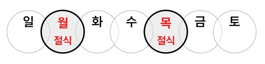 월, 목요일 (또는 화, 금요일 또는 수, 토요일) 실시하고, 나머지 요일은 다이어트 한약을 복용합니다.