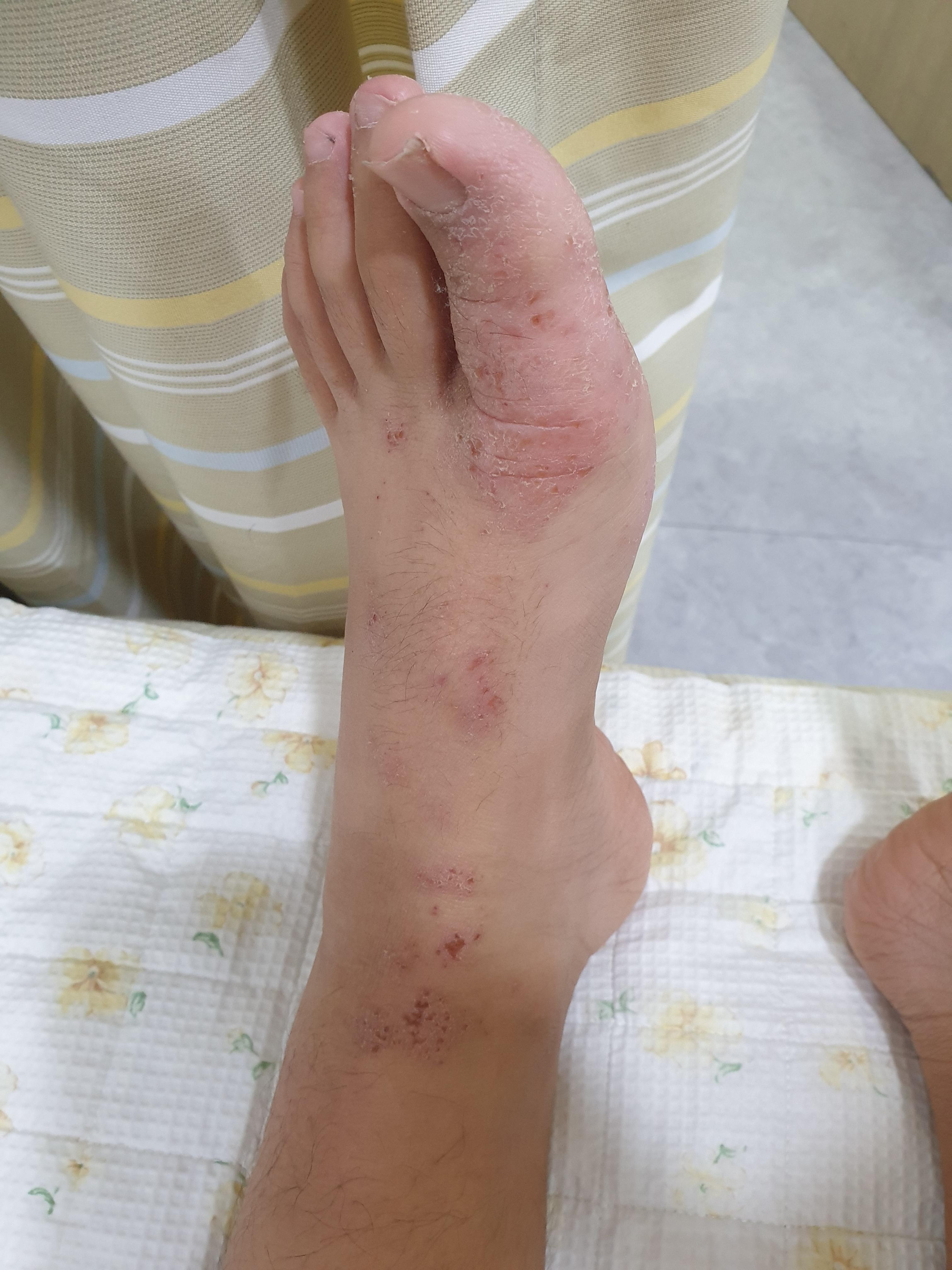 2021.9.10. 초진 내원한 13세 남자(초등 6학년) 아이의 발 한포진(수포성 가려움증, 습진양 가려움증)의 치료 호전 사례입니다.