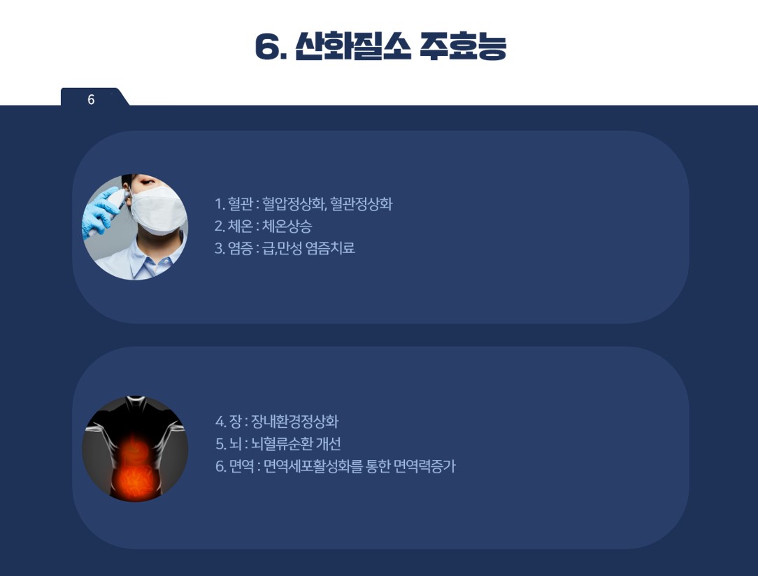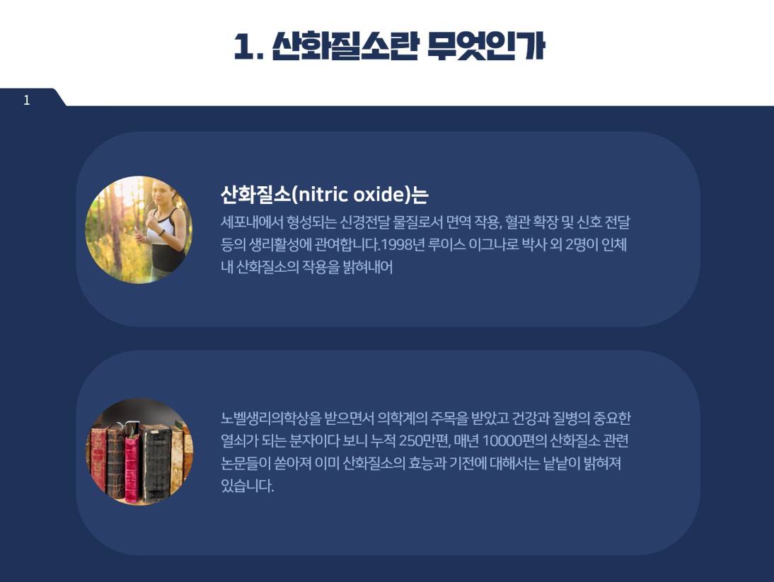 산화질소는 세포내에서 형성되는 신경전달 물질로서 면역 작용, 혈관 확장 및 신호전달 등의 생리 활성에 관여합니다. 1998년 루이스 이그나로 박사 외 2명이 인체 내 산화질소의 작용을 밝혀 노벨 생리의학상을 받으면서 의학계의 주목을 받았습니다.